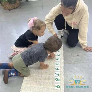 educadora-guiando-a-dos-ninos-mientras-colocan-tarjetas-de-numeros-sobre-alfombra-en-esplendor-montessori-guayama-puerto-rico