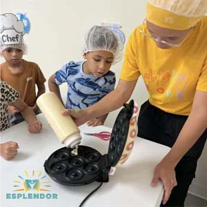 educadora-vertiendo-mezcla-en-maquina-para-donitas-mientras-ninos-con-gorros-de-chef-observan-en-taller-de-cocina-de-esplendor-montessori-guayama-puerto-rico
