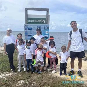 grupo-de-ninos-y-educadores-posando-frente-al-rotulo-area-de-manaties-durante-excursion-de-esplendor-montessori-guayama-puerto-rico