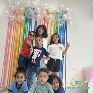 educadora-y-ninos-posando-felices-frente-a-fondo-de-arcoiris-con-globos-en-evento-festivo-de-esplendor-montessori-guayama-puerto-rico
