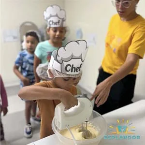 nino-con-gorro-de-chef-batiendo-mezcla-con-batidora-electrica-acompanado-por-educadora-en-esplendor-montessori-guayama-puerto-rico
