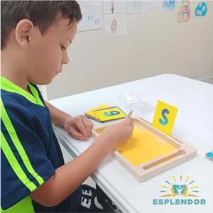 ninos-practicando-escritura-y-trazo-de-letras-en-mesa-de-trabajo-esplendor-montessori-puerto-rico