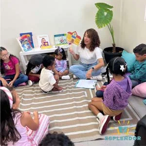 educadora-leyendo-cuento-a-grupo-de-ninos-sentados-en-alfombra-durante-momento-de-lectura-en-esplendor-montessori-guayama-puerto-rico