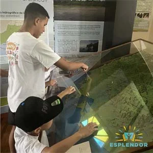 ninos-observando-y-senalando-mapa-geografico-en-centro-interpretacion-durante-excursion-de-esplendor-montessori