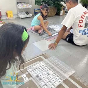 ninos-trabajando-con-letras-moviles-sobre-alfombras-en-actividad-de-lenguaje-montessori-en-esplendor-montessori-guayama